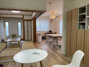 令和4年5月より開始予定の訪問介護の事務所が概ね完成しました。自身のヘルパー経験をもとに、外でがんばるスタッフさんが「リフレッシュできる」ステーションをコンセプトにしています。登録ヘルパーさんも募集を開始しますので、どうぞお気軽にご相談してください。画像にはありませんが、キッチンや浴室、洗濯機もあるので、家庭と仕事の両立がしやすいような環境を一緒に作りましょう。